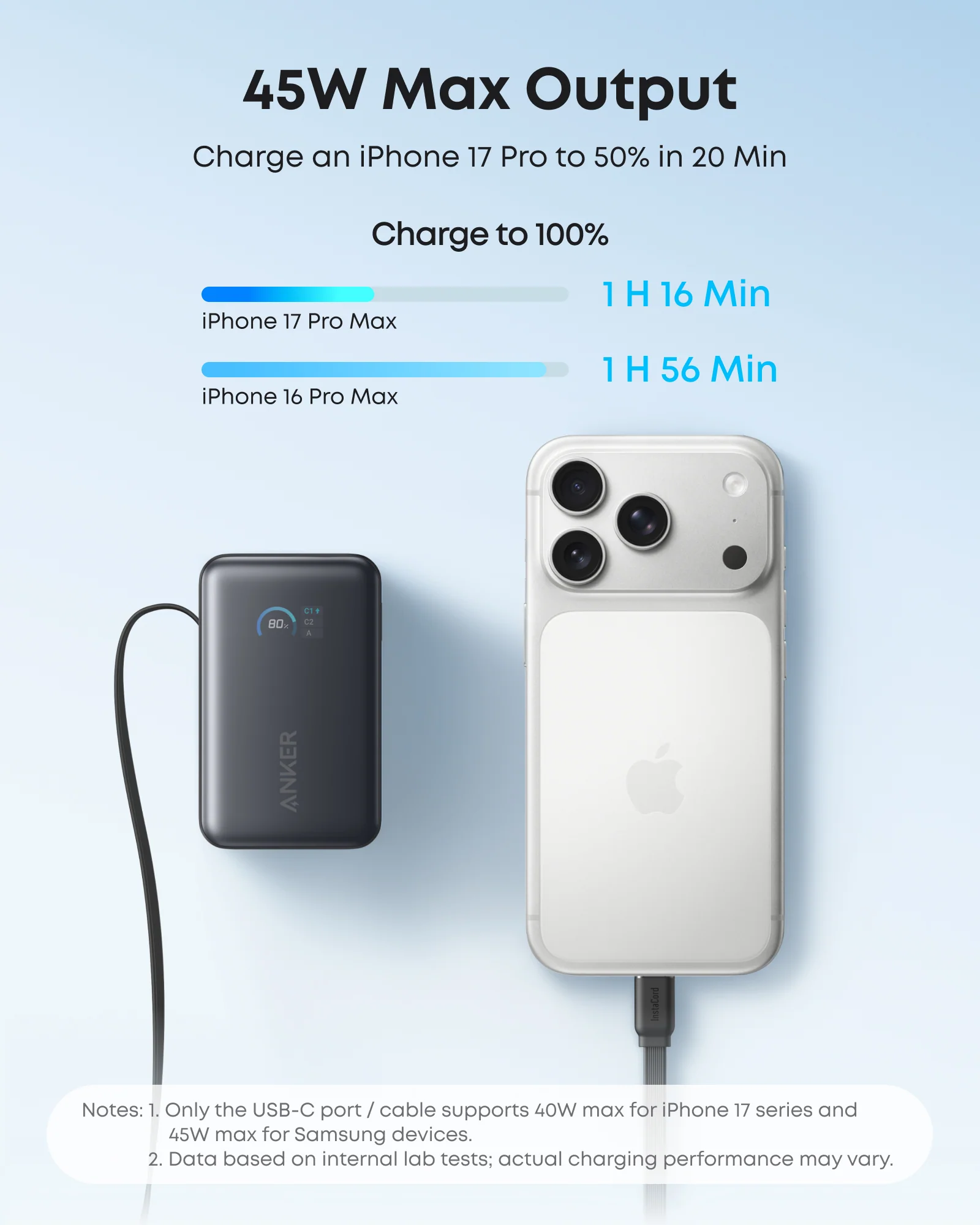 »Carga rápida de 45W, suficiente para muchos teléfonos y algunos laptops ligeros.