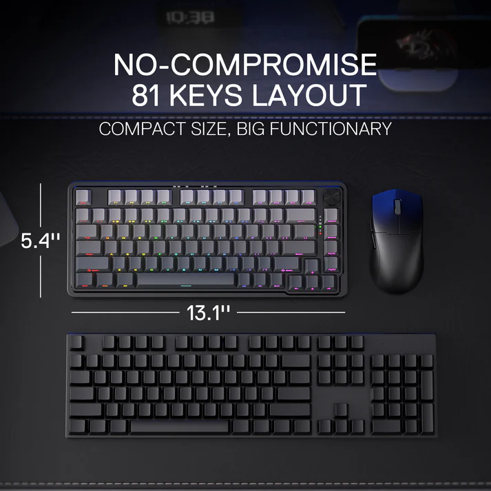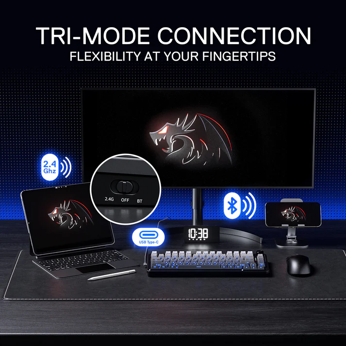 Descubre el Redragon Ucal Pro K673, un teclado mecánico compacto del 75% que combina estilo, funcionalidad y durabilidad. Con keycaps premium de PBT doble inyección, switches silenciosos Redragon green y tecnología gasket que amortigua cada pulsación para una experiencia suave y precisa, este teclado destaca por su conectividad triple modo: Bluetooth para uso casual, RF de 2,4 GHz con dongle para gaming competitivo inalámbrico, y modo cableado USB-C con adaptador USB-A. Además, su rueda de control multimedia y batería de larga duración lo hacen perfecto para largas sesiones de juego o trabajo, todo acompañado de una brillante iluminación RGB personalizable. El Redragon Ucal Pro K673 es la opción ideal para quienes buscan calidad profesional y máxima versatilidad en un diseño elegante y compacto.